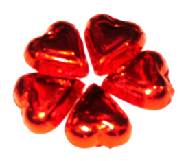 Milk chocolate hearts: the sweet taste of solid milk chocolate in the shape of a heart and elegantly wrapped in red foil.